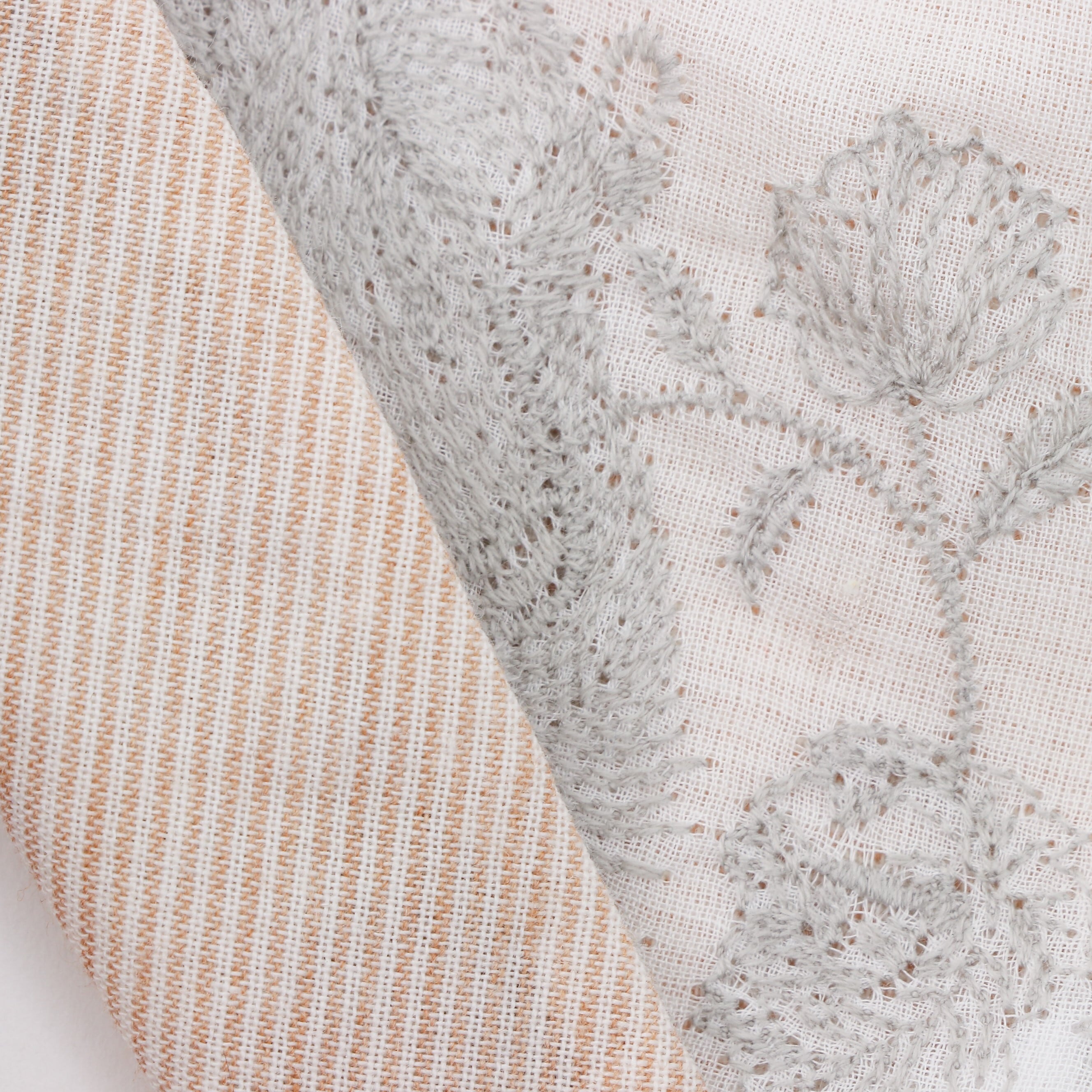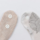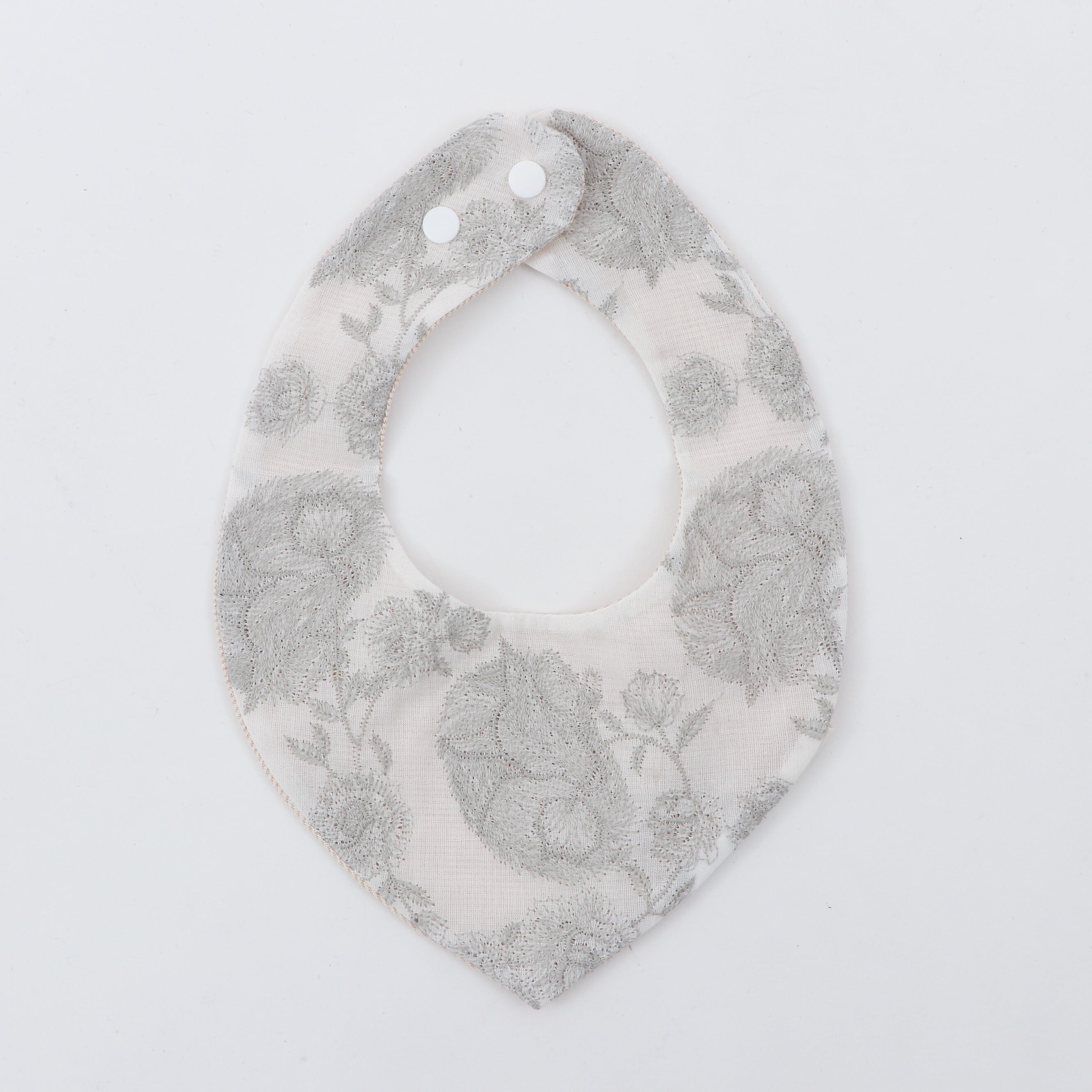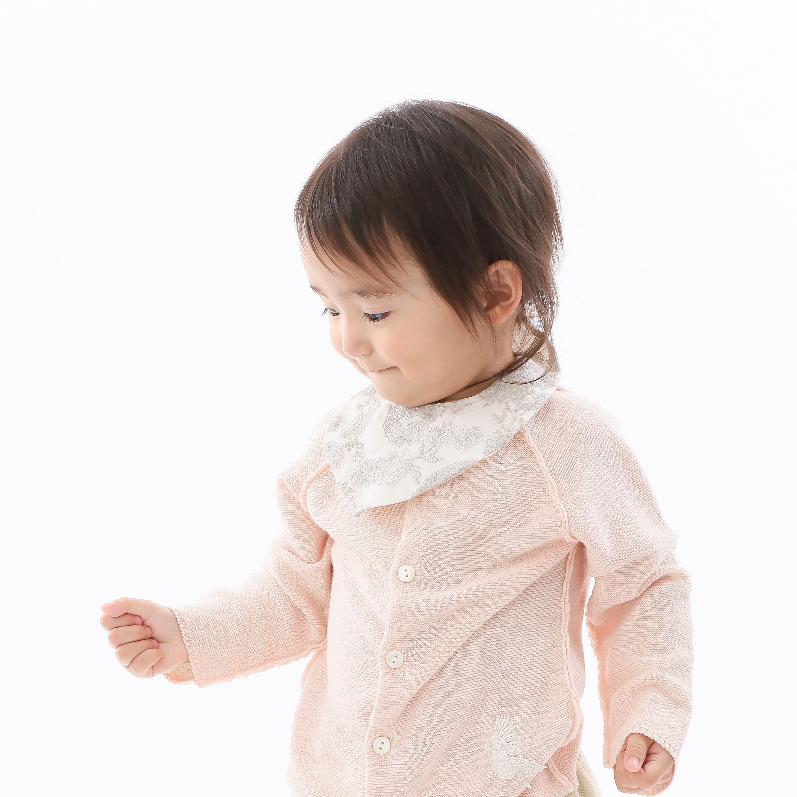 ■小鹿が赤い花を咥えている俳句から取った情景をイラストに、それを職人さんが忠実に再現したレースを使用したミニスタイ。裏はオーガニックのストライプ生地で、小さいながらも作り込みはしっかりとしたアイテム。小さなギフトにもいかがでしょう?